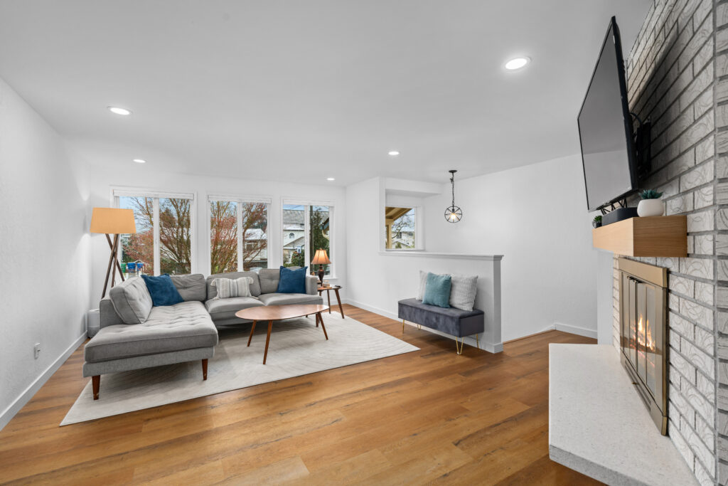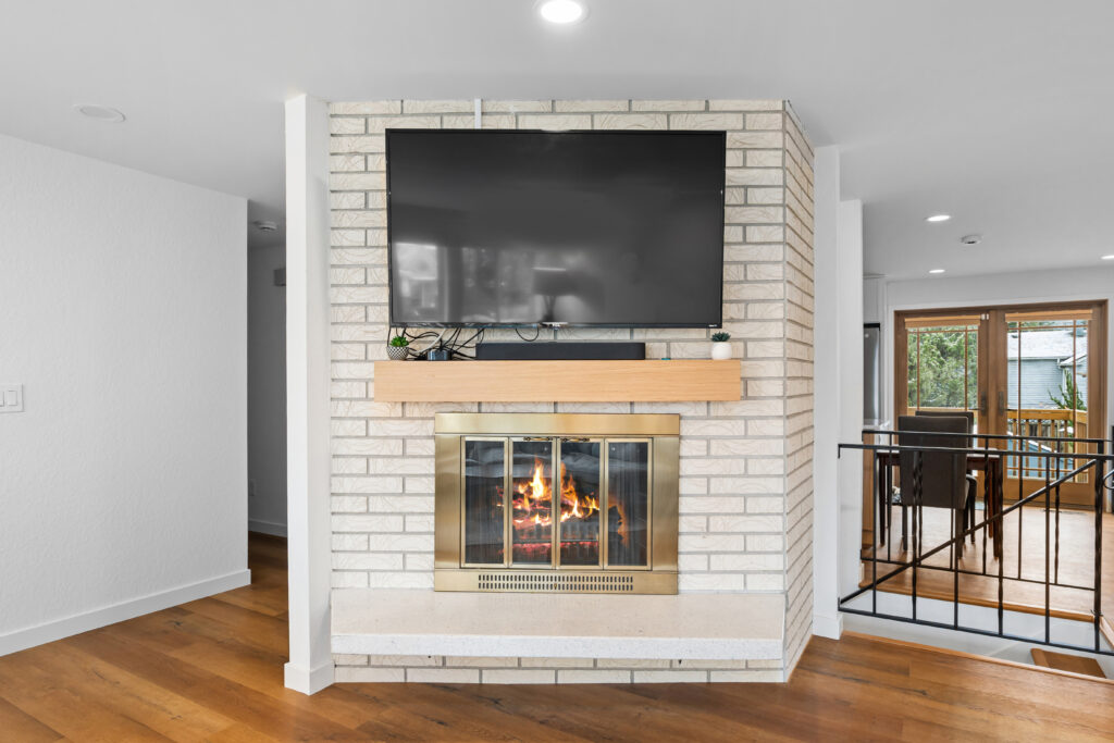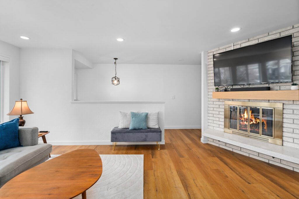 - A redesigned fireplace serving as a clean, contemporary focal point