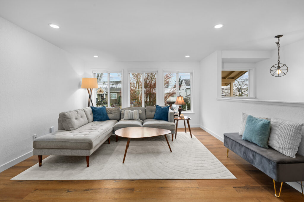 - Seamless visual transition between the living room and the basement staircase